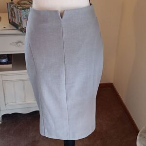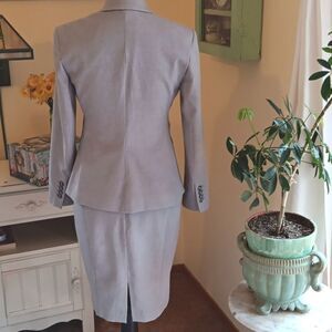 Elegant gray women's suit set. Includes blazer, skirt, and pants. Beautiful, woven washable light gray fabric. Jacket and skirt fully lined. All size 4. JACKET: Fitted, one button, four buttons on sleeves. Two faux pockets on each side. 36 at chest, 40 at bottom hem. 22 long from shoulder. Sleeves 22. SKIRT: Seamed. 28 at waist, 36 at hips, 32 at bottom hem for a perfect pencil shape. PANTS: Seamed in back. Ankle length. 2 pockets in front, faux in back. 30 at waist, 38 at hips, 9.5 inch rise, 28 inch inseam. Laundered. Perfect for professional settings. Great separates.