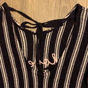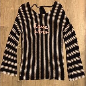 Express sweater with blue and white stripes. Says love wins in pink. Ties in the back. This is in brand new condition.
