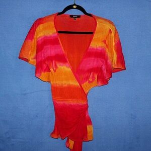Make a vibrant statement with this Express wrap top, featuring a captivating tie-dye pattern in bold shades of orange, pink, and yellow. This sheer and flowy top has a flattering V-neckline, short flutter or cape-like sleeves, and a long tie detail at the side/front for an adjustable fit. Made from 100% nylon, it's perfect for a standout look in warm weather, or for festivals and casual outings.
