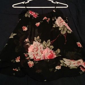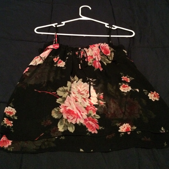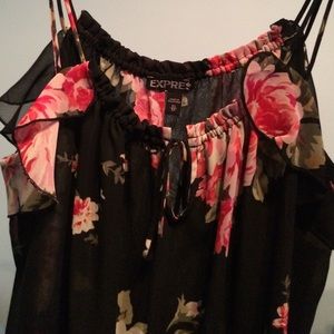 NEVER WORN. Express, party or casual cute top. Black with flowery design. Open shoulder, thin double straps. Can be a crop top. Slightly see through. Size: extra small.