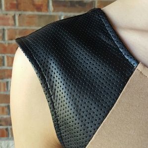 >The black part is leather with punctured detail, and the tan part is a cotton spandex material