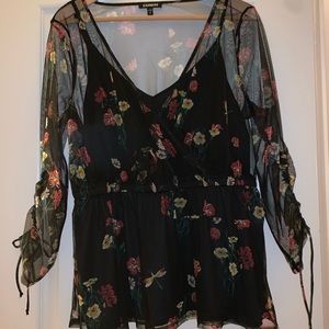Black, tulle/sheer floral top. 3/4 ruched tie sleeves. Super cute, never worn—only tried on. Elastic waist. Make it yours! Perfect for casual wear or dressy night outs. :)
