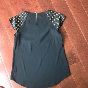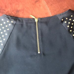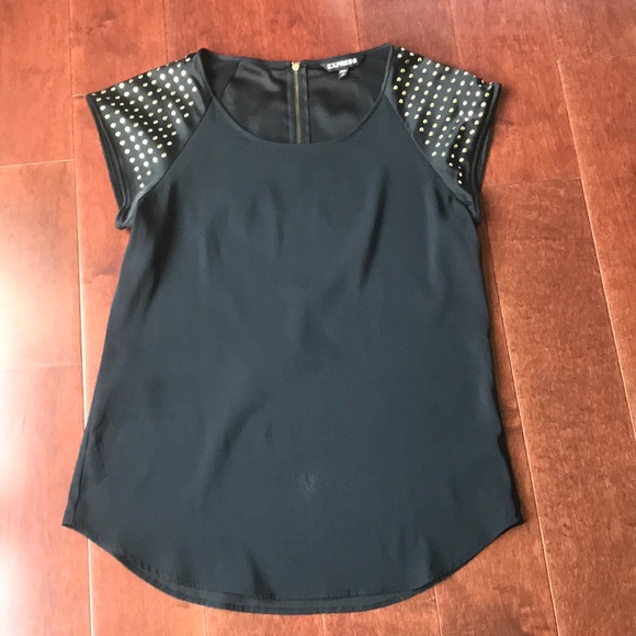 Black faux satin top with gold detail