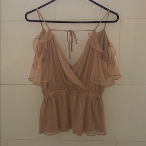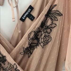 Nude top with balaclava floral detail. Thin strap with off the shoulder sleeve. Tie back