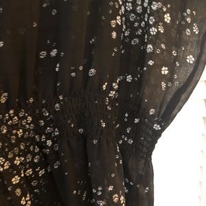 Flowy express top. Short sleeved. Would wear a tank underneath as it’s made to be a bit see through. Cinched at waist by elastic.