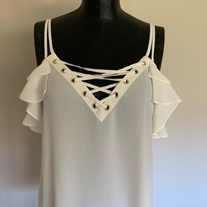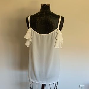 White Express top size medium. Silky material with ruffle details on shoulders. Great condition, worn once.