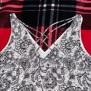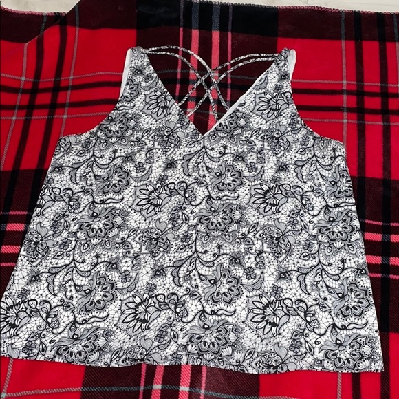 I’m great condition! Flowey top, color is black and white design. Size Large. Front is v style and back is v style along with across cross design.
