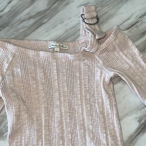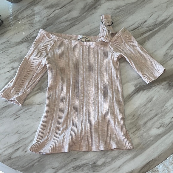 Off one shoulder with a buckle strap. Oatmeal color, form fitting
