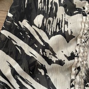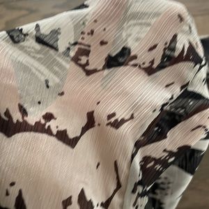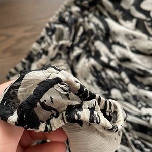 Super lightweight. No longer fits. Super cute in person, pictures aren’t doing it justice. Elastic band around arm cuffs and waist. V neck. Smoke free home. Perfect for the office or going out.