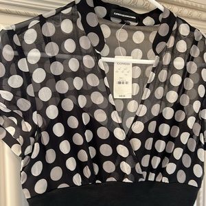 Top is a sheer material with built in black camisole underneath; bottom material is stretchy.