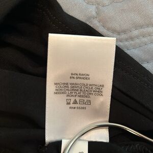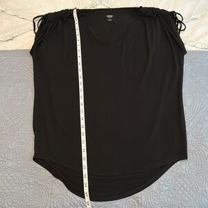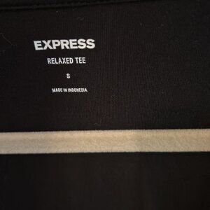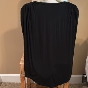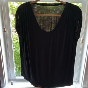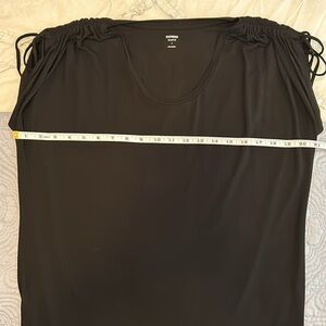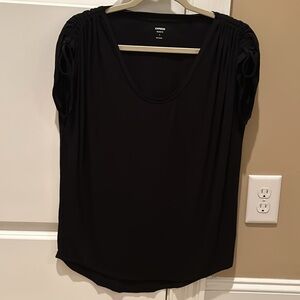 Pretty women’s Express top in black size small. It is their relaxed tee. Nice ruching detail on shoulders with ties. Rounded bottom hem. Slightly longer in the back. Can be dressed up or worn casual. Very soft fabric in 94% rayon and 6% spandex. Brand new. Smoke free home.