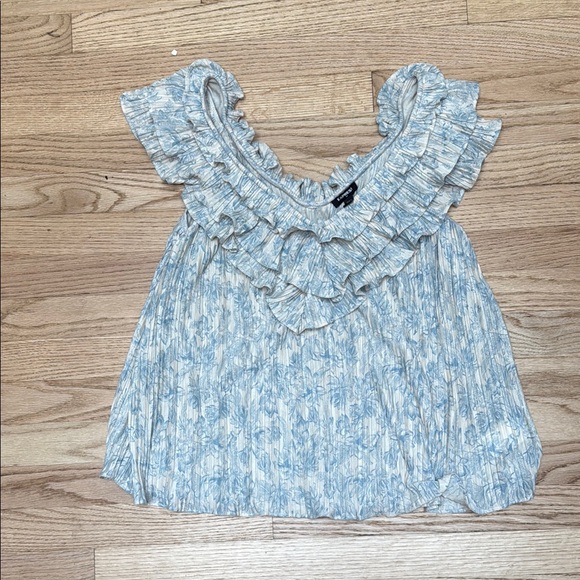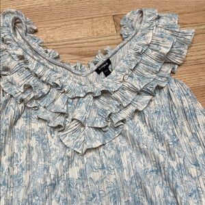 Beautiful light blue and cream top from Express size large. Features a fun ruffled neckline and drapey material. Great to dress up or down and layers easily to transition into fall!