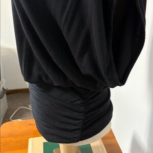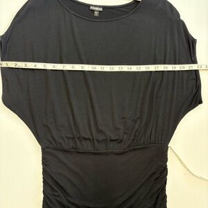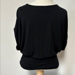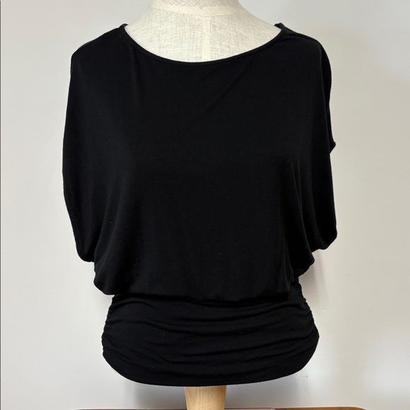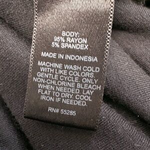 Dark Black Sleeveless Top is size Small but fits more like Medium. Generous bust and flowy fabric. Very soft stretchy fabric is 95% rayon and 5% spandex. Machine wash gentle and lay flat to dry. Has cute stretchy waist gathered (ruched) on each side to make a blouse on look. Please see photos for measurements and perfect fit.