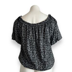 Express Top Cold Shoulder Wide Ruched Waist Leopard Print Sequins Black Gray Womens Size Medium