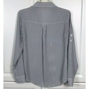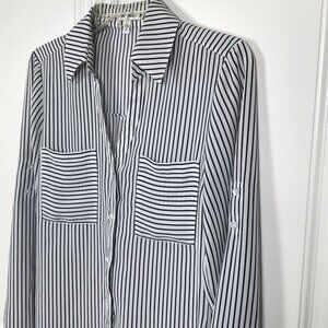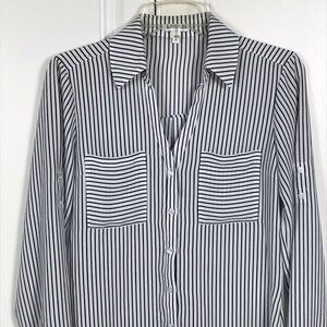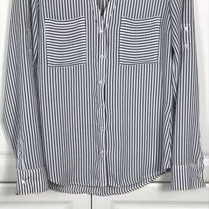 Express Women's Button Up Black & White Striped Blouse with Roll Tab Sleeves and Front Pockets