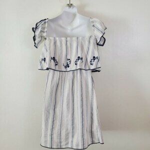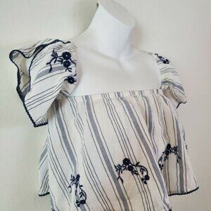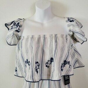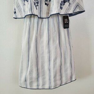 Express Top XS White Striped Floral Embroidered Boho Tunic Coastal Beach Casual