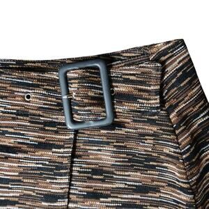 Step out in style with this vintage-inspired Express Tricot mini skirt! The skirt features a trendy wrap design and a flattering fit. The horizontal stripes add a touch of retro flair, perfect for a 60s or 70s style look. The combination of brown, black, and cream colors creates a versatile piece that can be dressed up or down. The skirt is suitable for both casual and academic settings. The skirt has a preppy look for academia or everyday wear.