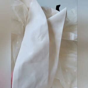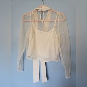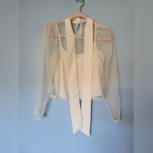 Express Tulle Polka Dot Tie Mock Neck Puff Sleeve Top Cream XS