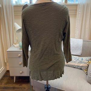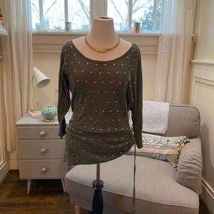 Olive green with brassy gold detailing. Tunic length with a tie on the side to adjust if you want. Size large.
