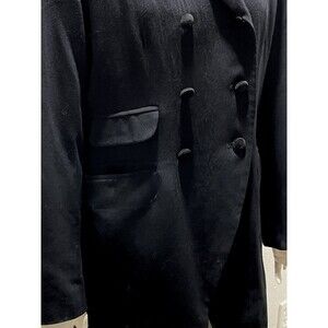 Vintage 90s Express Compagnie Tuxedo Jacket in size 9/10. Double breasted black tux with black velvet collar and buttons. Timeless notched collar, flap pockets, cuff buttons, and long length. Made in the USA in a breathable wool/rayon blend. Pair with leggings for a retro 90s look. Perfect for holiday parties and formal events.