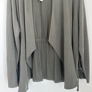 The cardigan (XL) offers a relaxed silhouette with a flowy open front, tie-cuff sleeves, and a gathered waist detail that adds shape. The pants (L) feature a comfortable elastic waistband with an adjustable drawstring and a tapered ankle fit for a polished lounge look. Perfect for travel, work-from-home days, or weekend relaxation, this set combines minimal effort with maximum style.