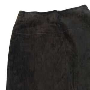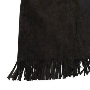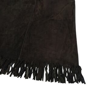Vintage 90s Express dark chocolate brown leather skirt with fringe. Size tag removed, see measurements. Fully lined. In gently preowned condition, no flaws noted.