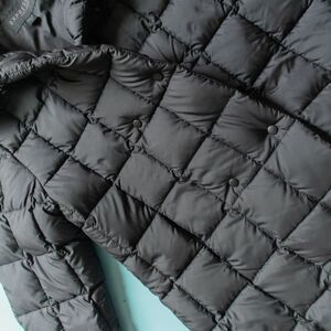 Features: Black quilted puffer coat with down filling and faux fur trim collar.