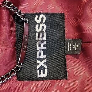 Beautiful cranberry red vintage Express moto jacket with peplum, faux pockets, and 2 hidden zippered pockets in Size Medium is fully lined.