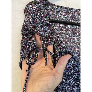 Details of Note: V-neck, defined bust, defined waist that ties around the back, short cap sleeve with a keyhole that ties in to a bow, black with white dots and purple and blue flowers, manufactured 2006