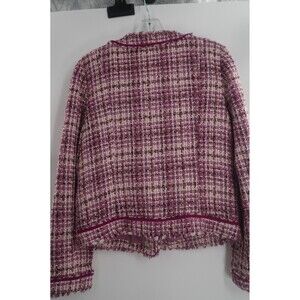 Pre-owned Express VintageY2K 2008 Design Studio Purple Pink Tweed Blazer Fringe Trim size 10. Elevate your vintage collection with this stunning Express Design Studio Tweed Blazer. Dated June 2008 (06/08), this piece is a beautiful example of late-2000s "indie sleaze" meets "quiet luxury". It features a rich multicolor tweed in vibrant shades of purple, pink, white, and black, woven with subtle metallic threads for a sophisticated shimmer. The collarless round-neck design and delicate frayed fringe trim offer a timeless, high-fashion aesthetic similar to luxury heritage brands.