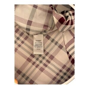 Express Women's Sleeveless Shirt White sleeveless v-neck shirt with maroon and black checkered pattern.