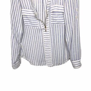 White and blue vertical striped long sleeve shirt with partial zip at neckline and roll tab sleeves. Collarless. Preowned with a spot on sleeve and on front bottom half. See last 2 photos.