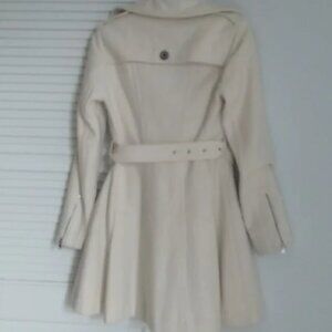 Looks beautiful tied, belted, or open. An ivory white wool coat with black buttons and silver hardware.