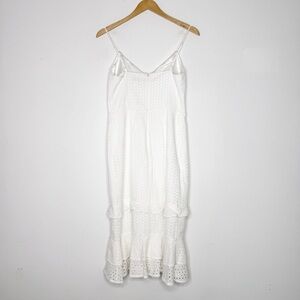 Keywords: Express eyelet dress, white cotton sundress, ruffle hem midi dress, summer party dress, casual bridal shower dress, beach vacation dress, white tiered dress.