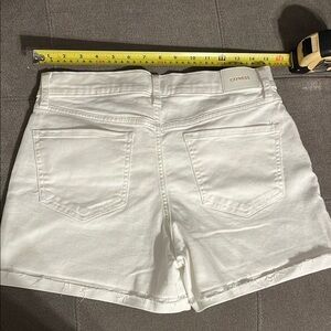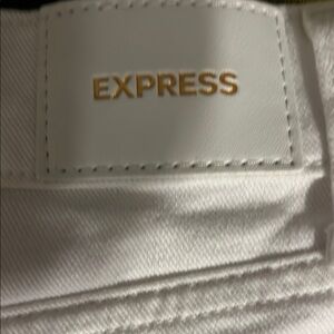 These white jean shorts from Express feature a trendy distressed design with intentional rips, offering a contemporary and casual look. Made from sturdy denim, they boast a clean, bright white color and a mid-length cut, perfect for a stylish summer outing.