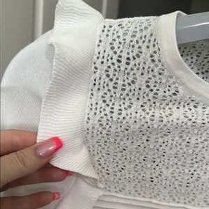 Elegant white blouse with lace details. Features ruffled shoulders. Perfect for a chic look.