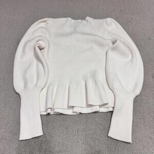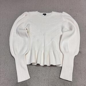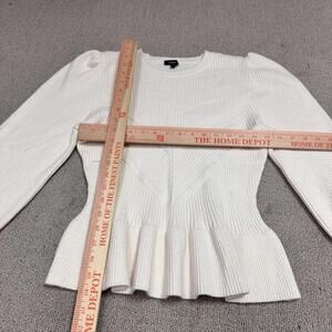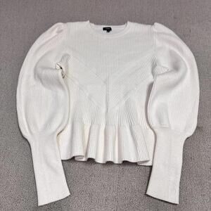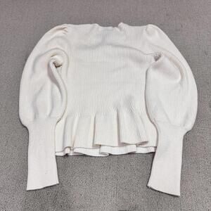 Elegant ribbed sweater with puff sleeves. Features a peplum hem. Soft and stylish.