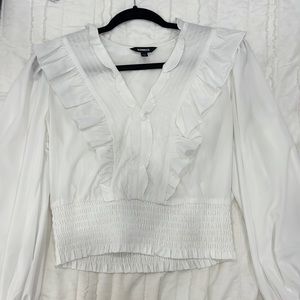 White ruffle blouse from Express, size small, slightly cropped, fitted at bottom, balloon style sleeves
