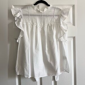 Elegant white top with ruffle sleeves and lace accents. Ideal for a chic ensemble. PtP 26 Length 26