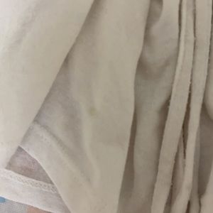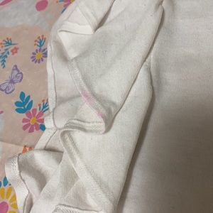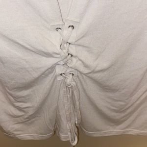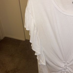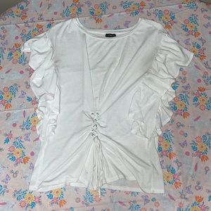 White ruffle Express top, size medium. This top laces up at the waist and can be tied into a bow. This item has been well loved and does have some imperfections (two stains and wear on the fabric). Please see photos for examples. It is very comfortable and is great for spring and summer!