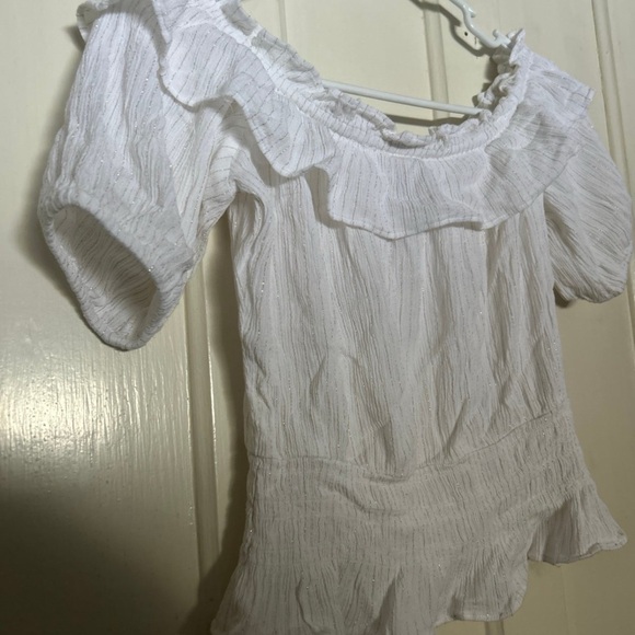 Chic off-shoulder design with ruffle details. Perfect for versatile styling. White with gold sparkly stripes.