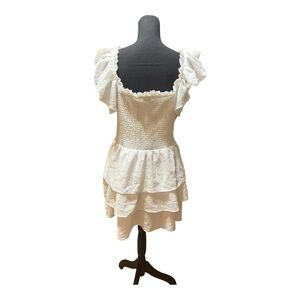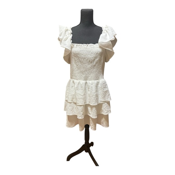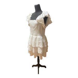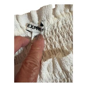 Express Ruffled Tiered Dress. Ruffled sleeves, smocked waist, tiered skirt. It can be worn off or on the shoulders. Size XL PP 17 L 33