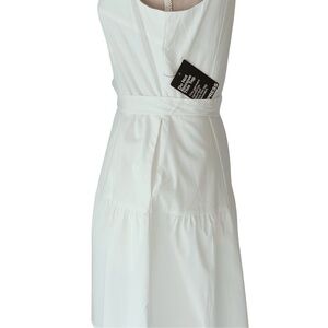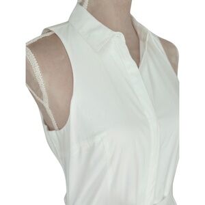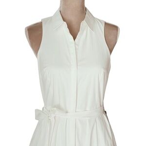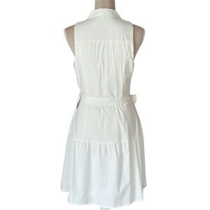 This white sleeveless shirt dress features a structured collar, subtle front placket, and a self-tie belt to define your waist. The softly gathered skirt and tiered silhouette make it perfect for warm days, office-to-evening looks, or casual weekend wear.