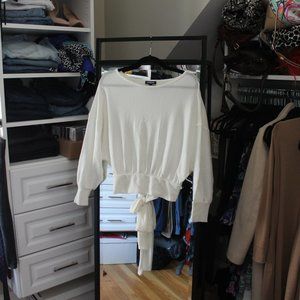 Express white tie back top in small. This top is open in the back and looks great with a bralette or tank. It is a light, waffle material and perfect with leggings, jeans or a dress. It's a great top for the spring/summer! There are a few small pulls in the front, as shown.
