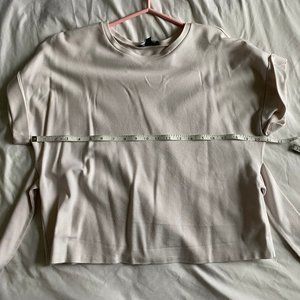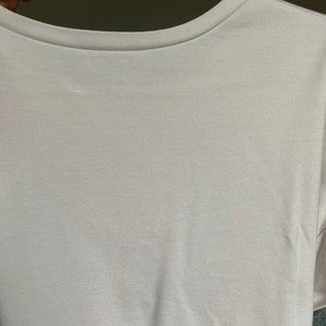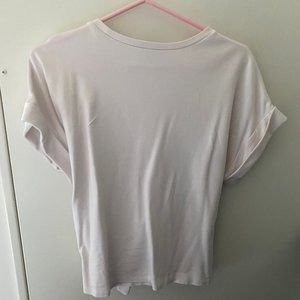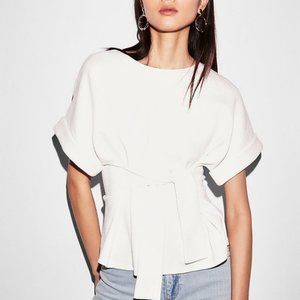 White Tie-Waist Oversized Top from Express. Size is XS but due to the oversize style, fits people who typically wear small/medium, especially since the tie-waist is adjustable.