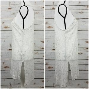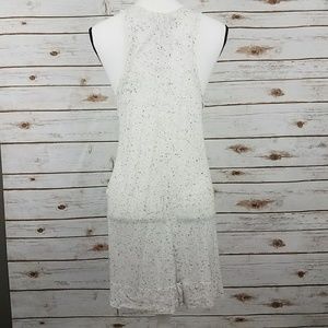 White tunic length tank with gray and black textured speckling detail. Features slight high/low hemline (front length is approx. 1.5 inches shorter than back). Subtle racerback and loose cut styling. Features side slits. In like new condition; minimal to no signs of wear. See image for approx. measurements in inches, lying flat. Rayon blend. Size medium. Brand: Express {@405dec}