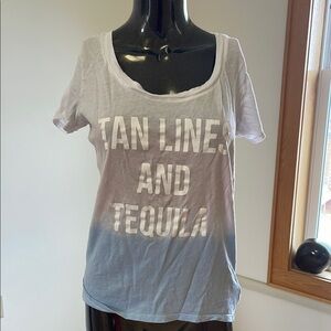 Casual short-sleeve top. Features 'Tan Lines and Tequila' text. Gradient design from white to blue. **Small mark on front of shirt as shown in pictures**