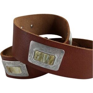 Design: Wide western leather belt with chunky buckle and concho style details with stone agate centers