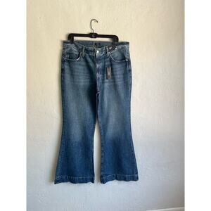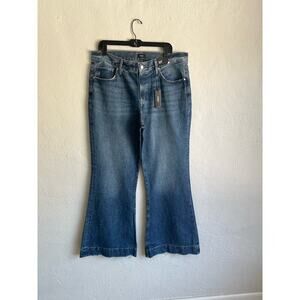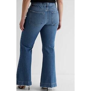 Express Woman Mid Rise Medium Wash Raw Hem '70s Flare Jeans, 14 R