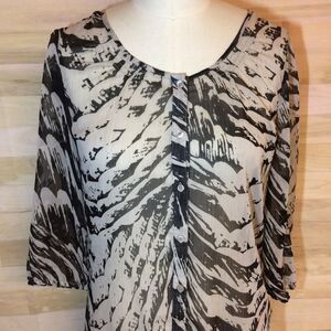 Express long sheer tunic/button down swimsuit cover up in black and gray patterned print with gray buttons. Can be worn as a blouse with a tank top underneath.